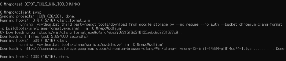 그런데, gclient 로 git 주소를 입력해준 다음에 'gclient sync' 부분을 입력하고 나면
