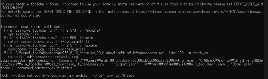 No downloadable toolchain found 라는 문구가 마지막에 나오게 된다. 그러면서 set DEPOT_TOOLS_WIN_TOOLCHAIN=0 이라는 지시사항이 나오는데, 이 지시사항을 그대로 CMD에 붙여넣으면 된다.