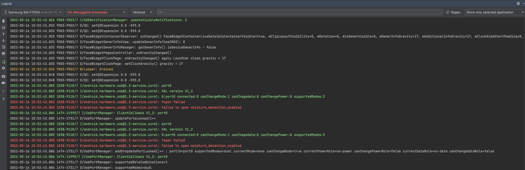 물론 Logcat 이 'No debuggable processes' 상태이기 때문에 디바이스 시스템의 로그가 전부 튀어나오는 상황이긴 하지만, 앱을 스튜디오를 통해 돌리고 있는 상황에도 충분히 필터링은 필요할 것이다. 그래서 Logcat 에서는 Filter Configuration 을 통해서 필터링을 할 수 있도록 도와주기도 하지만, 굳이 만들지 않아도 정규식으로 간단하게 조회할 수 있다는 것이다.