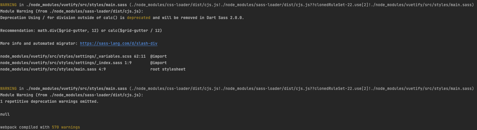 무수히 많은 Warning 들이 보이게 된다. 원인은 "Deprecation Using / for division outside of calc() is deprecated and will be removed in Dart Sass 2.0.0." 때문이라는데 컴파일은 되기 때문에 무시해도 상관은 없다. 나중에는 Vuetify 가 해결해 줘야 하는 부분이긴 하지만 현재에는 Warning 이 뜨는 걸 볼 수 밖에 없는 상황이다.