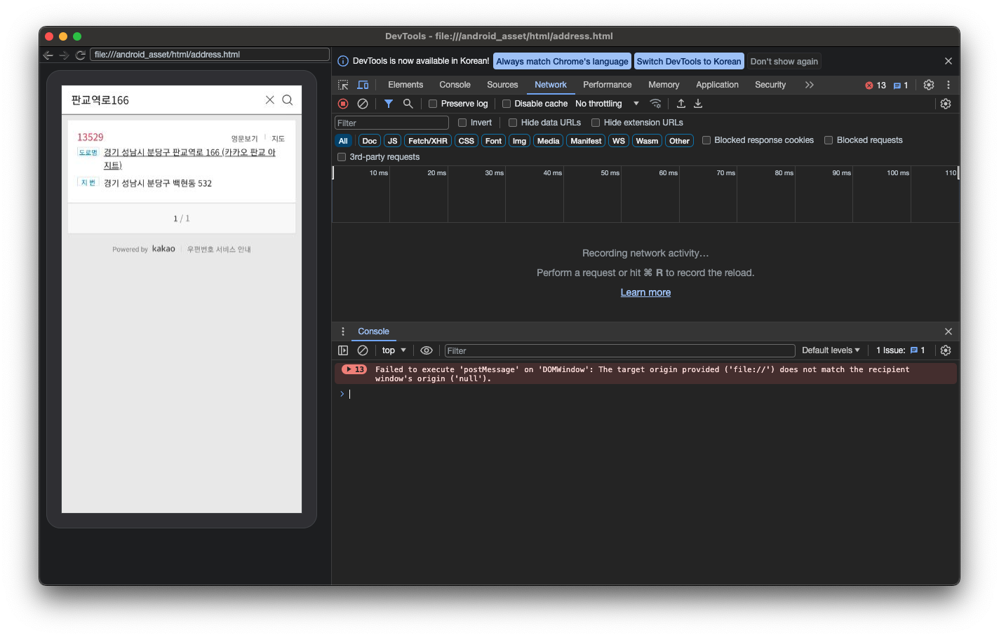 [ Failed to execute 'postMessage' ...... ] 라는 에러 문구를 뱉으며 이 후의 단계를 넘어가지 않게 된다. 이 문제의 원인과 해결법은 다음우편번호 Git Issue 에도 올라와 있다.
