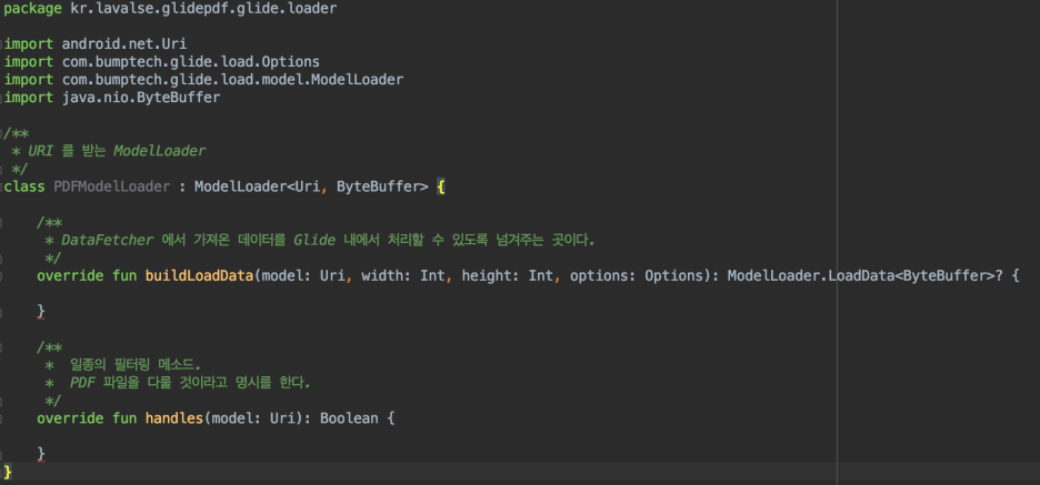 ModelLoader 는 Generic 이기 때문에 이를 상속하게 되면 첫번째 타입은 Model 의 객체가 될 것이고, 두번째 타입은 변환할 Data 타입이 될 것이다. 그래서 ModelLoader <Uri, ByteBuffer> 로 해서 상속을 받게 된다면 다음과 같은 메소드들이 자동 입력된다.