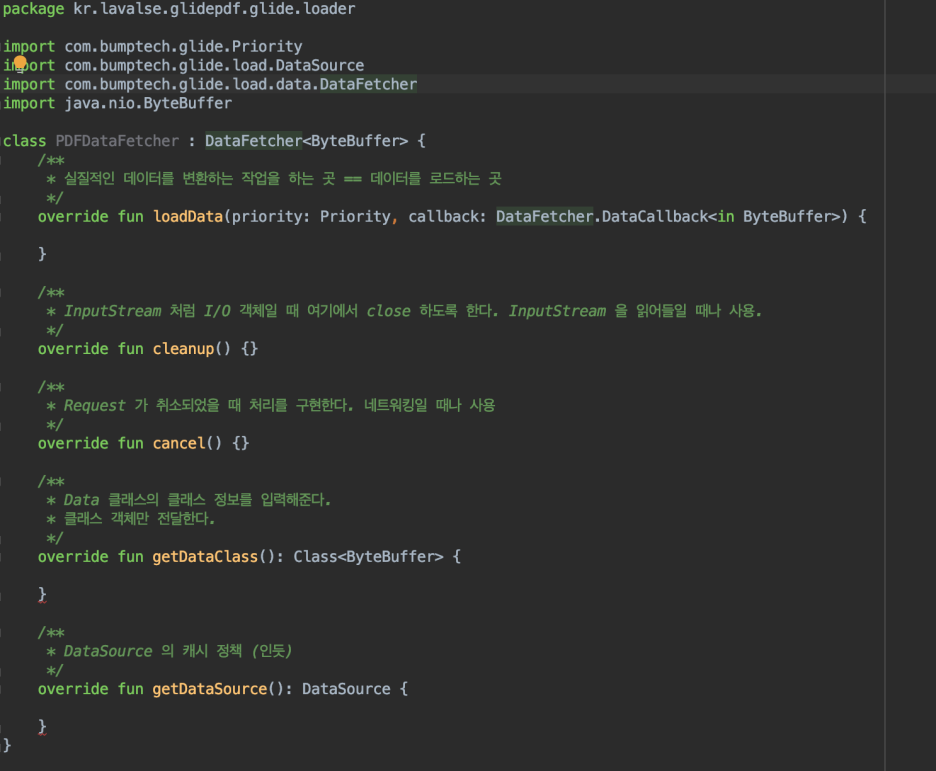 DataFetcher 도 Generic 형태인데 파라미터는 ModelLoader 로 리턴할 데이터 형태를 넣어주면 된다. 그러니까 ModelLoader Generic 의 두번째 타입을 넣어주면 된다는 것이다. 그리고나서 override 할 것들을 자동으로 불러오면 총 5개의 메소드를 override 하게 된다.