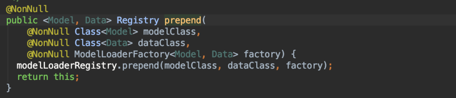 방식은 registry 라는 파라미터를 이용해서 등록만 해주는 것인데, 이 파라미터에는 다양한 것들이 존재하는데 그 중에서 prepend() 메소드를 사용하여 등록을 해 주도록 한다. append() 메소드도 있긴 한데, append 메소드는 새로 만든 것을 등록하기 보다는 기존 Glide 렌더하는 기능에 추가기능을 부여하는 것을 개발할 때 사용한다고는 써있는데 잘 모르겠다. 일단 공식문서에 나와있는 대로 따라서 해보면,